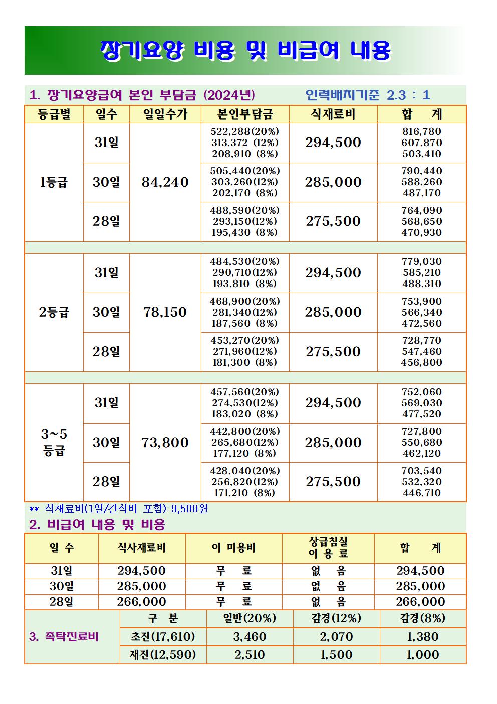 2024년 장기요양 비용 및 비급여 내용입니다.